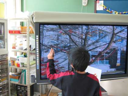 今日、国語の時間に「一本の木」を学習しました。デジタルカメラで、西西の森の木を撮ってきてパワーポイントでスライドショーをつくりました。それぞれの木の特徴を電子黒板に書き込みました。木も人間と同じで、一本も同じものがないということがよくわかりました。