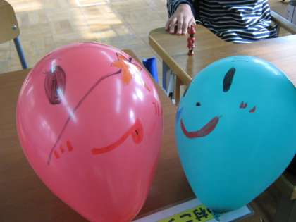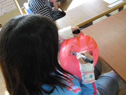 今日の中間休みに、4年生の友達が遊びにきて風船に絵をかいて遊びました。上手にかいてくれました。風船バレーをして遊びました。