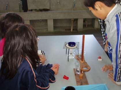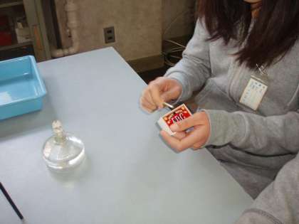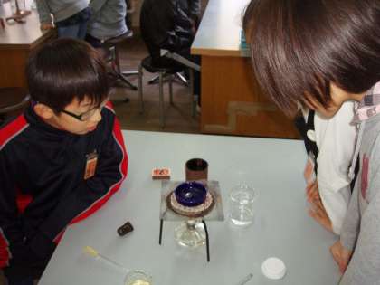 ろ液を蒸発皿にとり,熱しました。