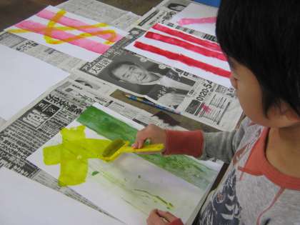 図工室でローラーで和紙に色つけをしています。どんな作品に仕上がるのかがとても楽しみです。