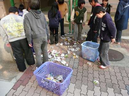 昼休みに,持ってきてくれたアルミ缶を足でつぶしてかさを少なくします。