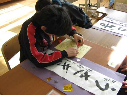 書初めしたはんしを、紫色の台紙にはってその台紙に金紙と銀紙で飾り付けをしました。すごくきれいにしあがりました。