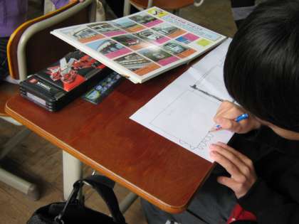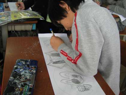 図工の学習が、今日からステンドボックス作りにはいりました。今日は、どんな模様にするのかその下書きです。大きくていねいに書きました。上手にできるといいです。