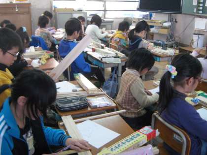 図工ではのこぎりやかなづちを使って木の工作を作ります。今日は材料の木を見て何を作ろうか,スケッチをしました。どこで切ってどうつないで・・・イメージを広げています。何ができるか楽しみです。