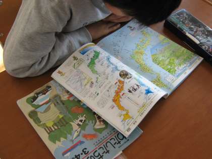 今日、社会の時間に日本の国土について学習しました。盆地や山脈について、地図帳で学習しました。