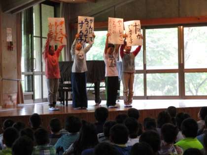 山の家の二日目,全員元気です。昨夜は雨が降りましたが,今朝は止み,すべて予定通りプログラムをこなせています。今朝は他の小学校も一緒に朝の集いをしました。代表の児童が西京極西小学校の良さを堂々と紹介しました。