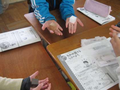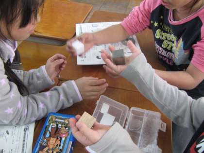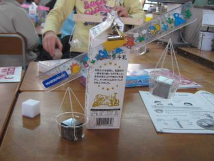同じ形・同じ体積の鉄・アルミ・プラスチック・木の重さを比べました。見た目でまず予想し,手に乗せて体感したあと,自分たちで作ったてんびんに乗せて比べてみました。予想はばっちり,的中しました。