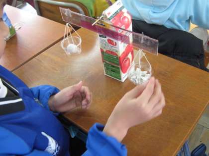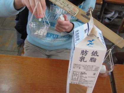 1年生に借りた油粘土で同じ形同じ重さの玉を2つ作り,片方の粘土を細かくちぎっていきました。形が変わると重さはどうなるかの実験です。細かくしても,薄くのばしても,違う形にしても重さは変わらないことが確かめられました。