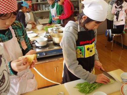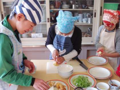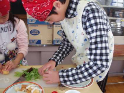 教えていただいた通りに野菜を切ったり,おもちをつめたりして