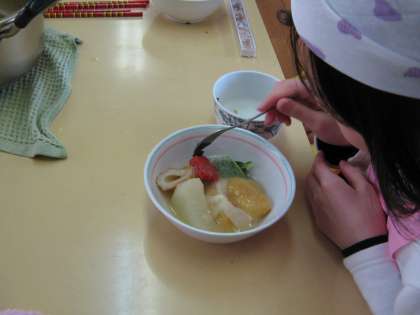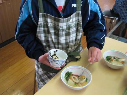 ほかの野菜をきれいに盛りつけます。最後に,みんなが作ったダイコンおろしのみぞ れあんをかけていただきました。