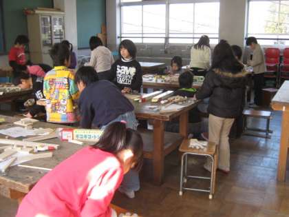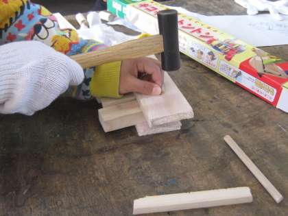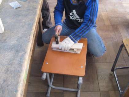 今日はかなづちの使い方を学習し,のこぎりで切り終わった子からくぎを打ちはじめました。くぎをまっすぐに打ちこむのはなかなか難しく,指を打った子もいましたが,だんだん慣れてくると,教室にトントンという音がひびきました。