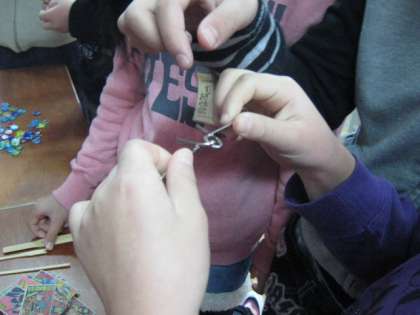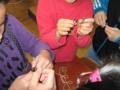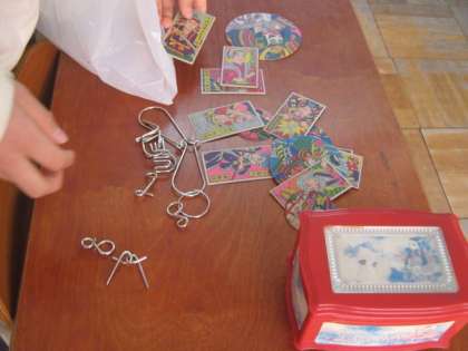 むかしの遊び道具を持ってきてくれる子がたくさんいます。お母さんがおばあちゃんに買ってもらった「キャンディキャンディ」のオルゴール,メンコ・おはじき・竹とんぼ・ベーゴマ・知恵の輪など,子どもたちにとってはめずらしいものが多く,うまくは遊べないけれど興味深く試していました。また,「ずいずいずっころばし」を友だちといっしょにやって見せてくれた子もいます。