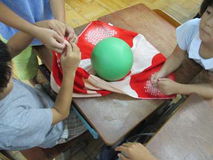 実際にふろしきでみんなの持ち物を包んだり,すいかのかわりにボールを包んだりしました。