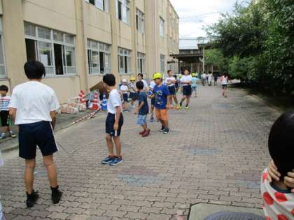 今日は縦割り活動の日です。毎月10日はこころの日として,人権学習と縦割り活動を行っています。今日は,久しぶりに天候もよく涼しい日で,子供たちは元気いっぱいに遊んでいました。広い運動場や体育館で異年齢の子供たちとなわとび,ドッジボール,鬼ごっこをして遊んでいます。