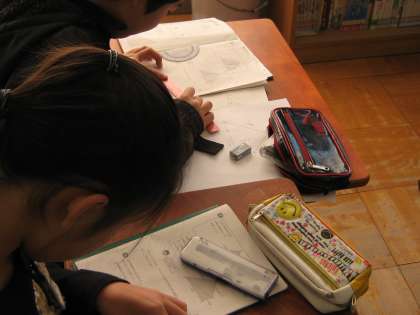 ここまで学習してきた合同な三角形の書き方を使って,四角形の拡大図,縮図を書いています。書き方の確認や発表には,やはり電子黒板が有効でした。画面を見ながら,ていねいに書くことができました。