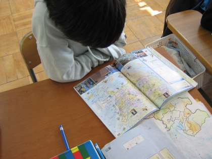 社会の時間に、ALTの先生の出身地のシカゴをさがしました。地図帳の調べ方の練習として取り組みました。
