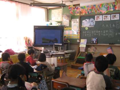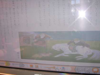 電子黒板でデジタル教科書の朗読を聞いています。みんなお話に夢中になって聞いていました。
