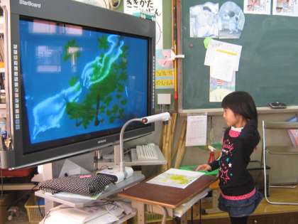 自分の作ったクイズを実物投影機で電子黒板に大きく映し,発表しあっています。