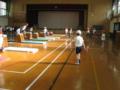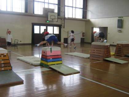 ふみこしとび,とびあがりとびおり,よこ開脚とび,たて開脚とび,など自分で目標をもっていろいろな跳び方に挑戦しています。