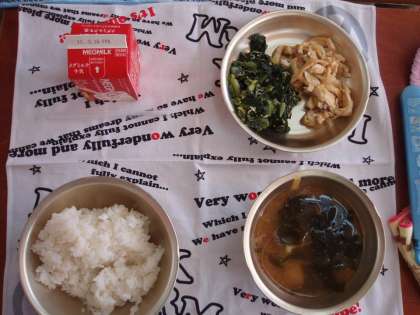 今日の給食は,牛乳・はい芽米ご飯・きつねどんぶりの具・