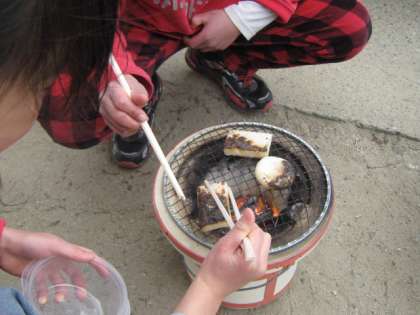 むかしの暮らしの学習の1つとして,七輪を使っておもちを焼く体験をしました。古新聞でまきに火をつけ,そこに炭を入れておこしました。炎がおさまって赤くおこった炭の暖かさは,子どもたちにとって初めての経験で,じっくり焼いたおもちはとてもおいしかったです。