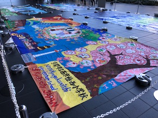 8日の休日に京都駅で本校作成の「西西キッズゲルニカ」が展示されました。フランスの作品,醍醐中学校の作品とともに飾られ,多くの観光客の方が立ち止まって見て楽しんでおられました。