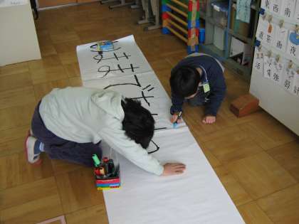 今度、お世話になった6年生を暖かく送る会があります。そのときに使う垂れ幕を作りかした。6年生には、ぼくたち3組は本当にいろんなことでお世話になりました。感謝の気持ちを込めて、真剣に作っています。