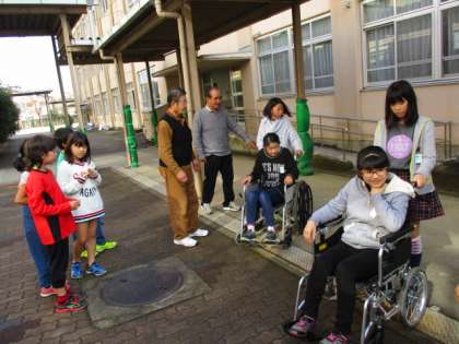 4日に4年生の総合で車いす体験をしました。介護老人福祉施設の花友にしこうじの職員の方や学校運営協議会の方々にお世話になり,子供たちが普段に地域のお年寄りと接する際に車いすを扱えるように学習しました。車いすの安全な扱い方や車いすを利用されている方の思いなどを考えながら自分たちも順に押したり乗ったりしました。