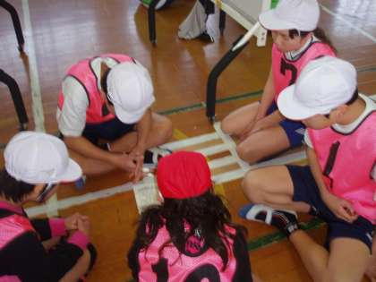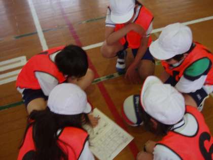 1試合目が終わるとグループで集まり,反省会をしています。