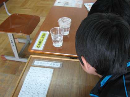 理科の時間に、水の蒸発の実験をしました。金曜日に、コップに水を入れて日の当たるところにおいておきました。そして、デジタル教材で確認しました。