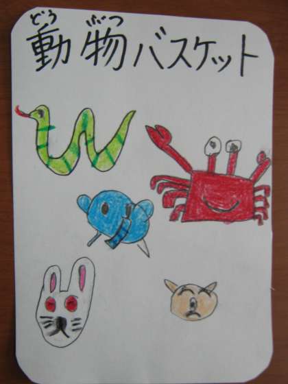 動物バスケット?なんだろう、と思ってる人もいると思いますが、フルーツバスケットの動物版です。ゾウ・うさぎ・ぶた・へび・かにの5種類で遊びます。人数が多くなれば、動物の種類も増やせばいいわけです。