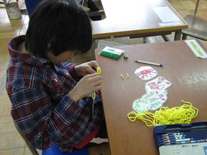 動物バスケットで使う小道具を、休み時間と5時間目に作りました。26人分作るのは大変でしたが、とても楽しかったです。これで、2年生と交流したいと思っています。