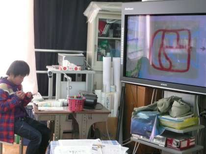 電子黒板を使って,もえるもんを使って,その行きかたを,透明のシートにマジックで書いてみんなに説明しています。
