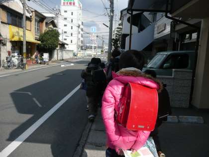 早速,新登校班長が先頭になって集団下校をしました。この1年間頑張った登校班長はその集団の最後に歩いてアドバイスする役をあと1週間頑張ってもらいます。