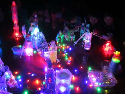 最後に体育館のステージの中を真っ暗にして,作品を飾りみんなで鑑賞会をしました。