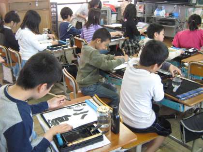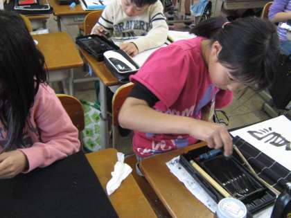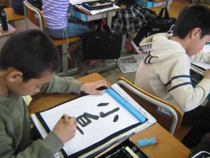 1組の6校時は書写です。「小鳥」を書きました。しっかり墨をすって,ていねいに書いていました。みんな書いた作品を見せ合い,満足そうな表情を見せていました。