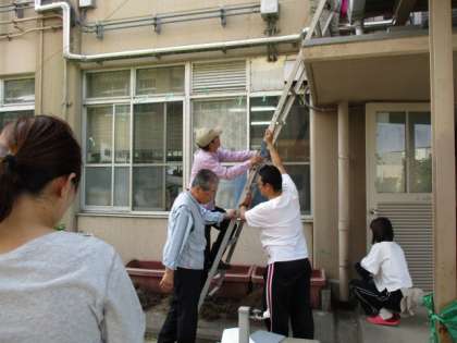 今日は,学校運営協議会の方々と教職員で緑のカーテンを設置しました。ネットをつなげたり,植木鉢の土を入れ替えたりしました。これから,アサガオ,ツルレイシ,ひょうたん等を植えます。つる性の植物が育っていけば,緑の葉が暑い夏の日差しを和らげてくれます。子供たちは,花が咲き実がなることにも興味をもって育ててくれると思います。