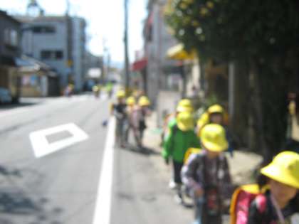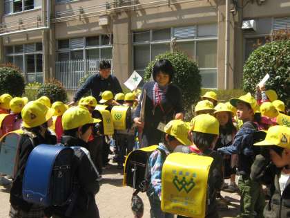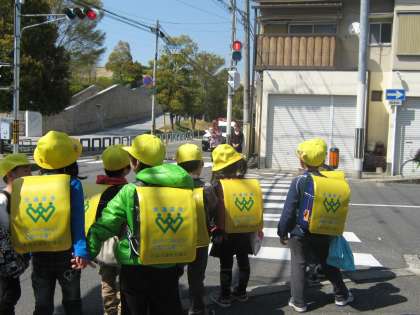 中庭に帰る方向ごとに集まって,先生といっしょに並んで帰ります。道の端を一列に並んで上手に歩いています。横断歩道では信号が青になるまでちゃんと待って,上手にわたります。事故にあわないように気をつけて帰ってね。