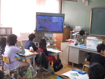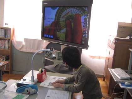 分度器を使って,180度より大きい角の測り方を学習しました。どのようにして測ったのか自分の考えたやり方を前に出て説明しているところです。手元を電子黒板に映しながらしっかり説明できました。