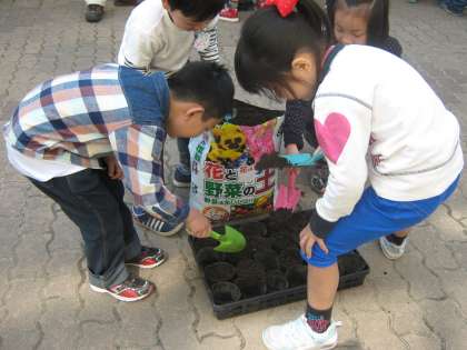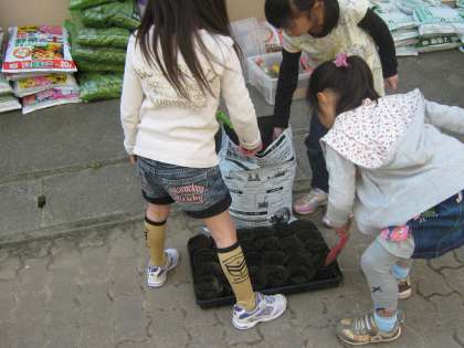 西西校では,夏に校区の一人暮らしのお年寄りのおうちに,お花を届ける取り組みをしています。今年もそろそろ種まきの時期です。1年生はポットに土を入れる仕事を担当しました。たくさんのポットに移植ごてで土を入れていきます。こぼれたり足りなかったり,苦労したけれど全部で300個のポットに土を入れることができました。3年生が種まきをしてくれたら,全学年が交代で水やりをします。