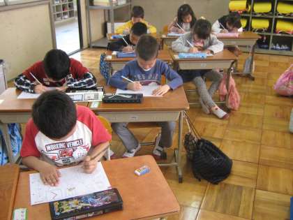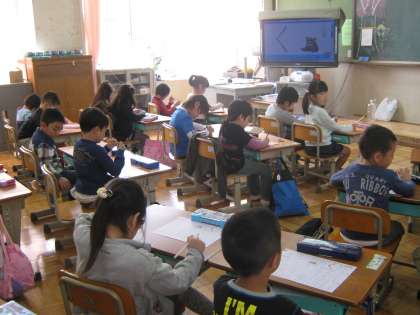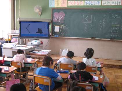 1年生が楽しみにしていたひらがなの練習が始まりました。電子黒板に大きく映して形や書き順を練習します。線が画面上で実際に動いていくので,1年生にも分かりやすく,楽しく学習しています。