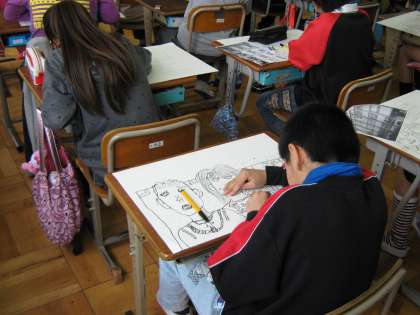 図工の時間に、よく見てかこうを学習しています。友達の顔をよく見てかいています。細かいところまで注意してかいています。