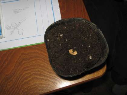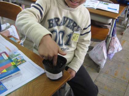 1組では,ツルレイシの種をまきました。季節による植物の成長の違いを調べるためにこれから育てて観察していきます。