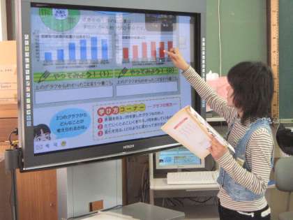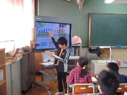市の給水人口と給水量のグラフを読み取り,電子黒板を使ってわかったことを発表し合いました。