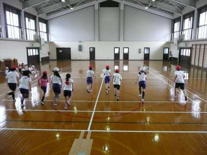 シャトルランをしています。電子音の合図で,頑張って持久走の力を発揮します。