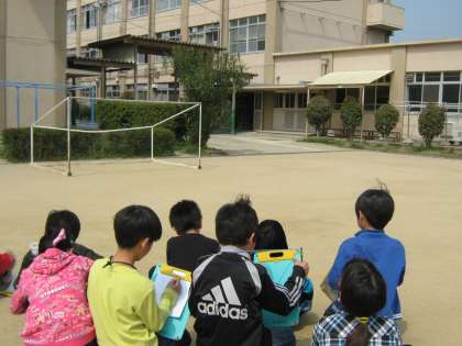 「雲はどんな動きをしているのかな?」「雲が変わると天気はどうなのかな?」などと話し合いながら,雲の様子を観察しています。午前,午後と同じ場所で様子を比べています。