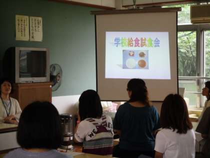 栄養教諭から給食についてのお話の後,給食室や子供たちの配膳の様子などを見学し,家庭科室で試食してもらいました。