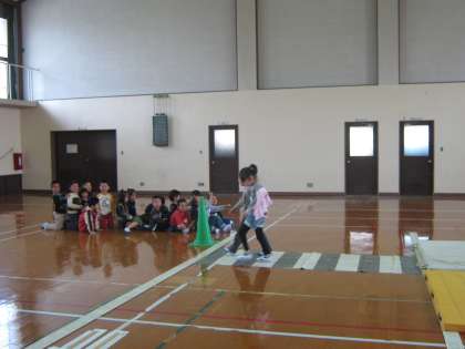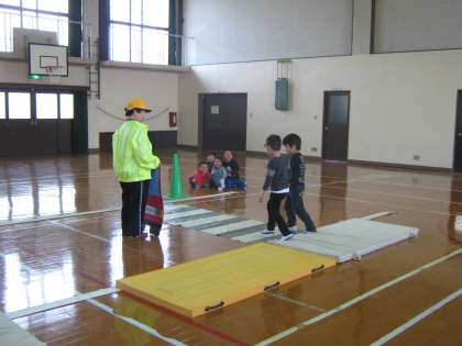 お話を聞いた後は体育館に作った道を歩く練習をしました。おうちを出るときや道の角では立ち止まって右・左をしっかり確認します。地域の方やおまわりさんが車になって時々通られる道を,慎重に歩いていく子どもたちでした。