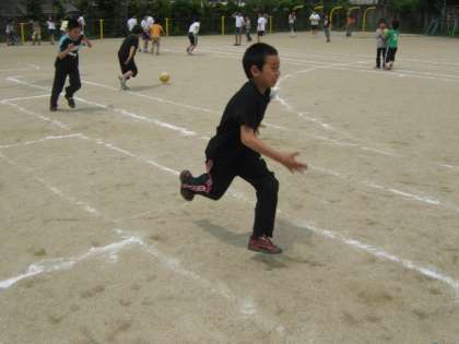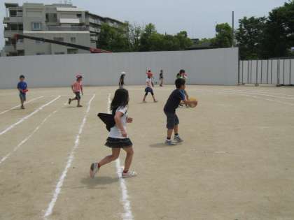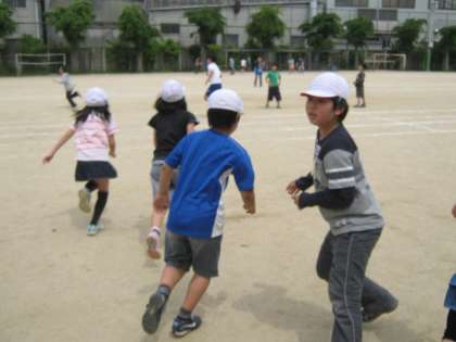 1組も2組も元気よく遊べています。1組はボール遊びをしたり,100m走のコースを使って走ったりしていました。2組はみんな遊びで鬼ごっこをしていました。
