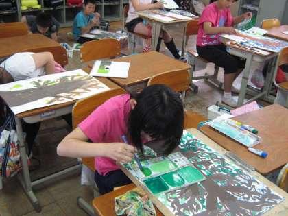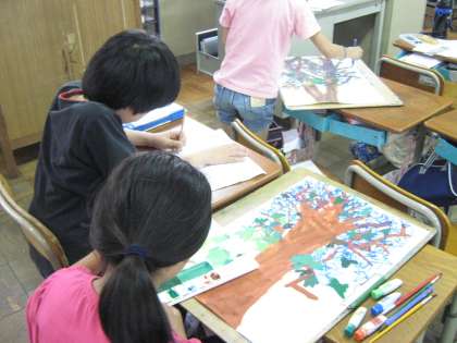 学校のトウカエデの木も,5月になり葉が生い茂ってきました。1組では4月に描いたトウカエデの絵に葉を描きました。立派な木になりました。